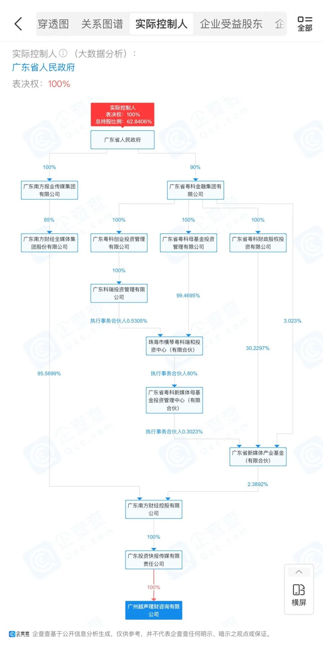 股权穿透显示,越声理财属于南方财经全媒体集团旗下公司。